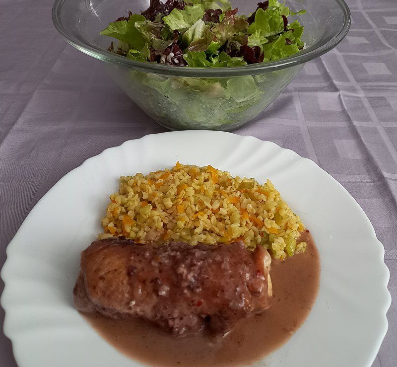 Bulgur na poru in korenčkom, nadevan zrezek v črnem vinu