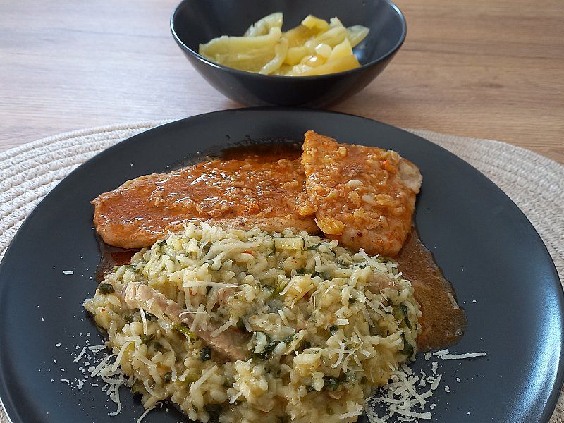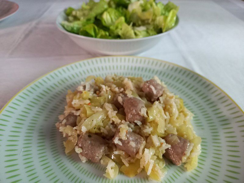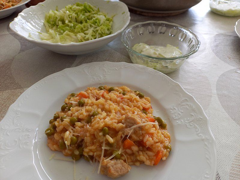 Rižoto, zeljnata solata in kumarice z jogurtom