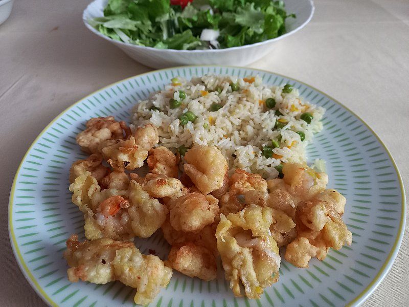 Basmati riž s korenčkom in grahom, kozice in kolobarji kalamarov v tempuri; zel