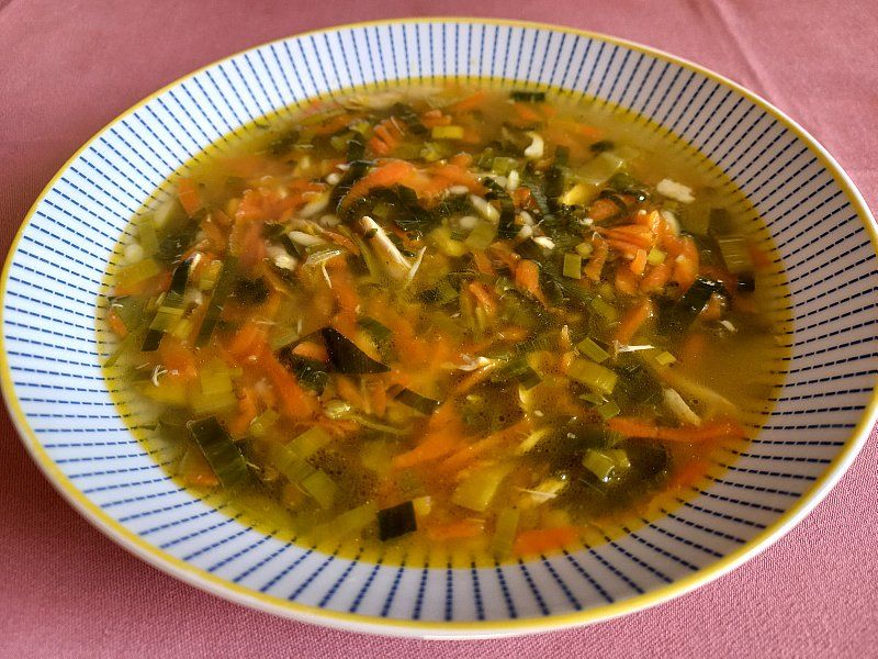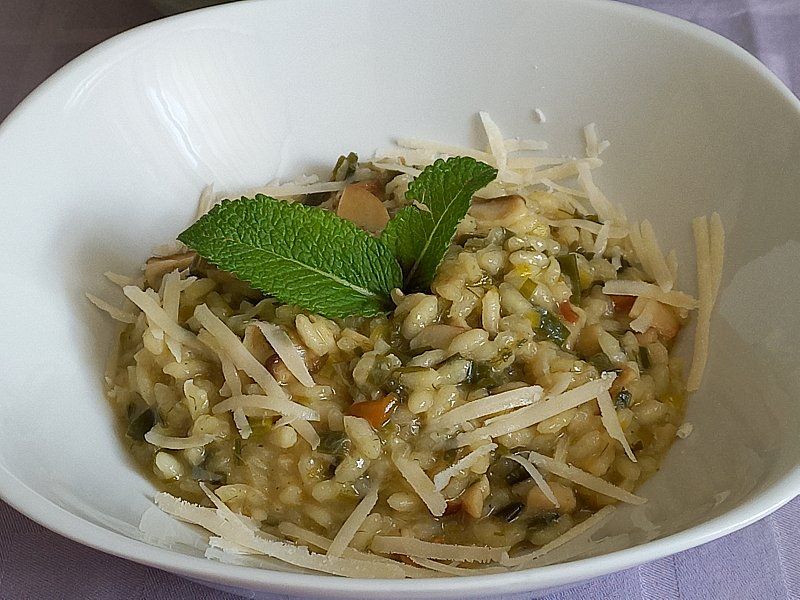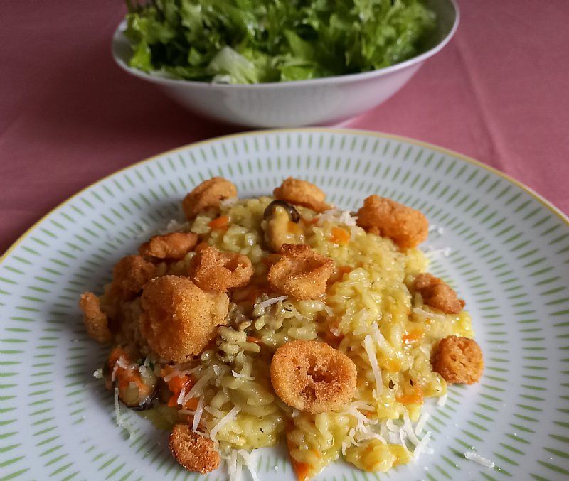Rižoto z lignji, korenčkom in bučko, po vrhu frigani lignji in kozice; zelena s