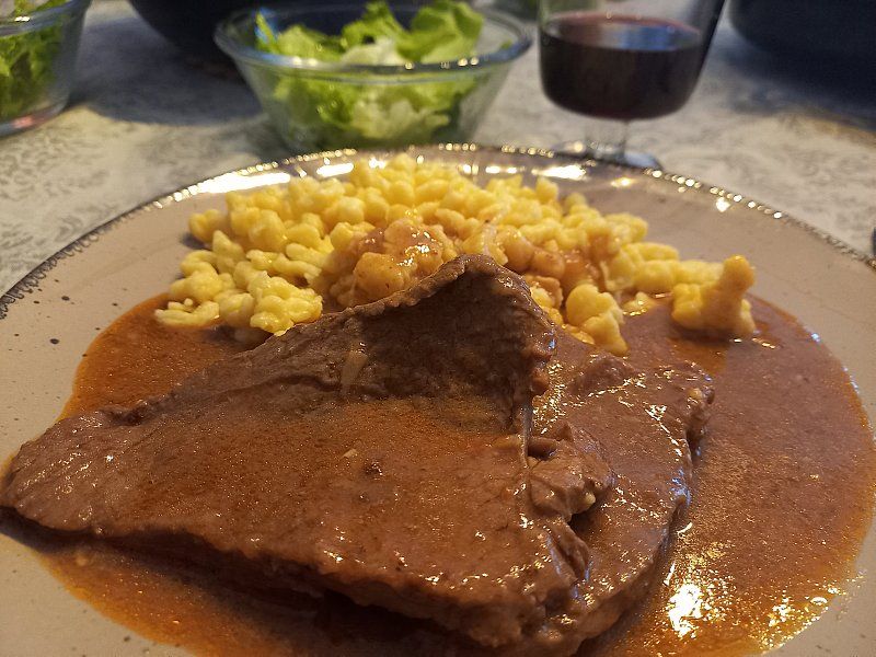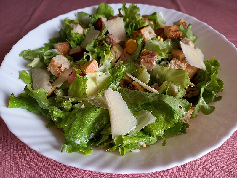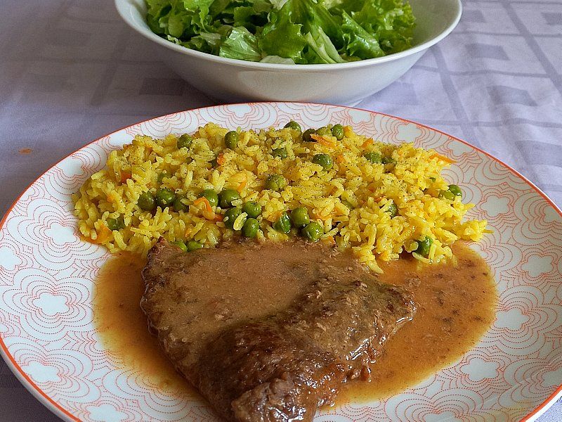 Goveji zrezek v naravni omaki, basmati riž s korenčkom in grahom; zelena solata