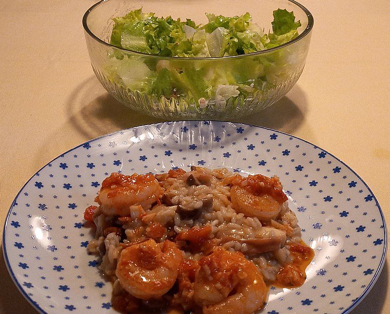 Rižoto s hobotnico, po vrhu popečene kozice; endivija s krompirjem in ocvirki