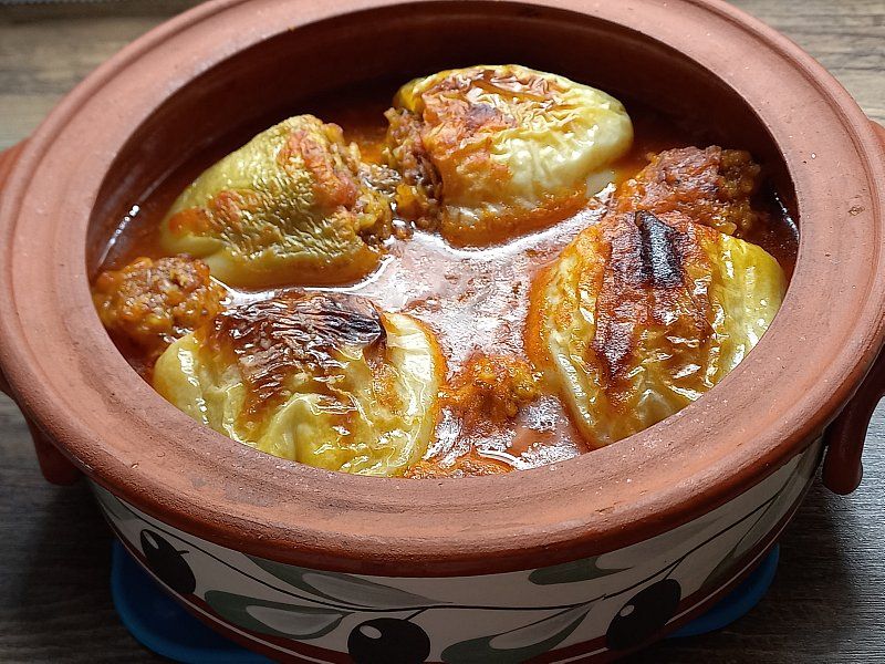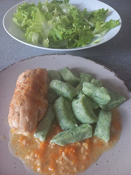 Nadevani puranji zrezki, zeleni njoki; zelena solata