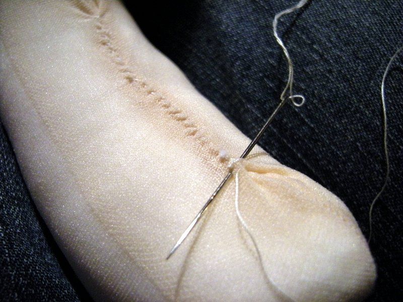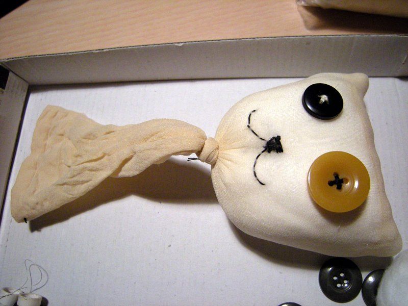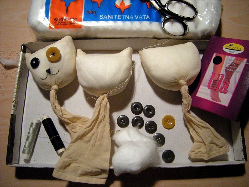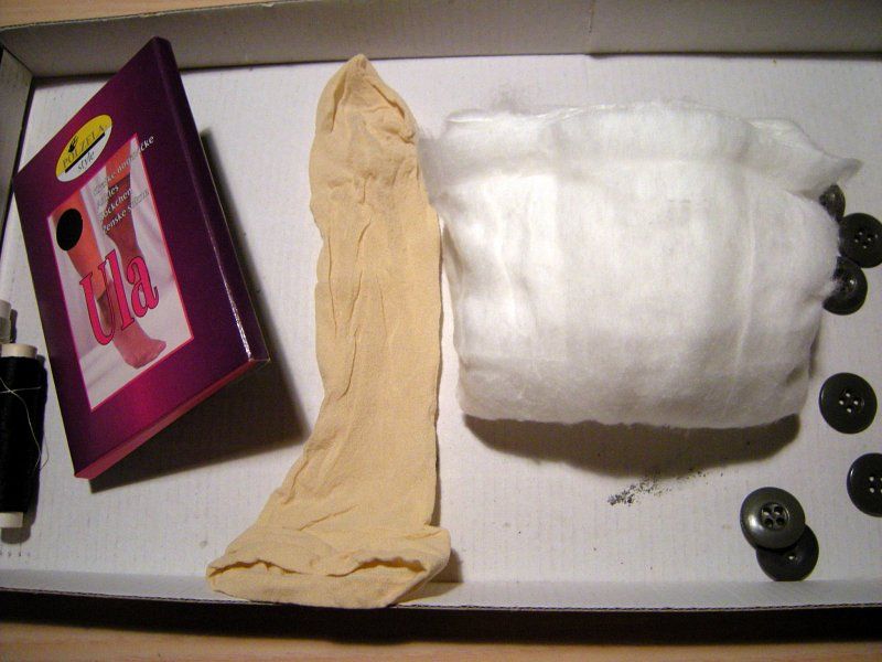 najprej si pripravimo najlonske nogavičke, vato, sukanec in iglo, gumbke ...