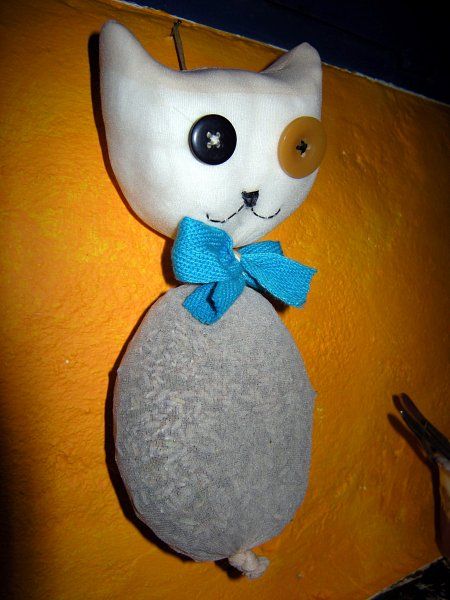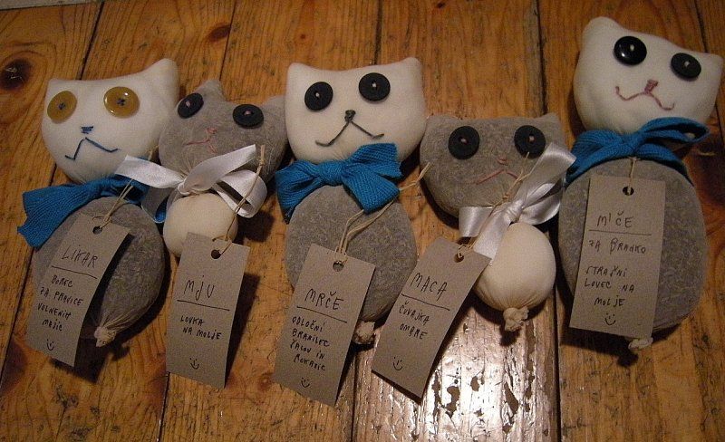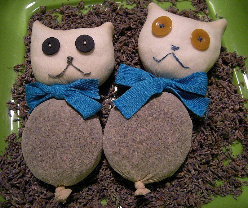 Opis izdelave "mačkastih" dišavnih vrečic, polnjenih s sivkinimi cvetovi in nekaj mačjih portretov