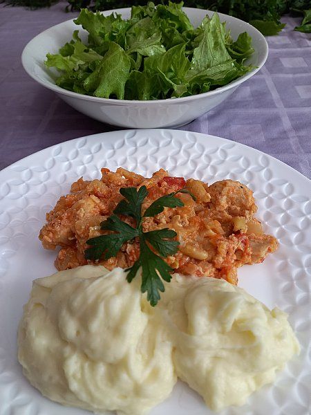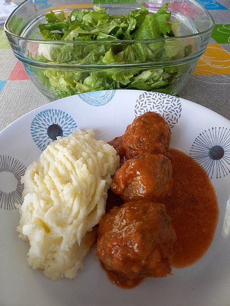 Čuftice v paradižnikovi omaki, pire krompir; zelena solata