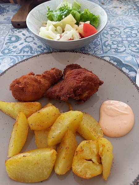 Pečen krompir, paniran piščanec, zelena solata, šopska, zeljnata, kumarice z jo