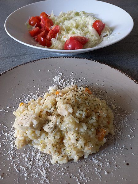 Piščančja rižota, zeljnata solata, paradižnik