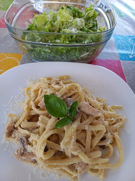 Rezanci v beli omaki (šampinjoni, belo piščančje); zelena/zeljnata solata