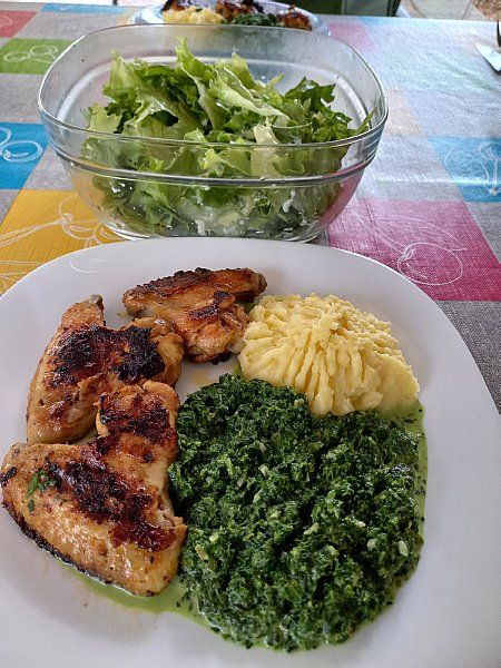 Pečene perutničke, špinača, pire krompir; zelena solata