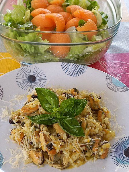 Dagnje v rižoti; zelena solata z melono