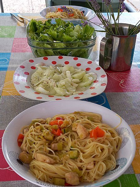 Špageti v piščančje-zelenjavni omaki; kumarična in zelena solata