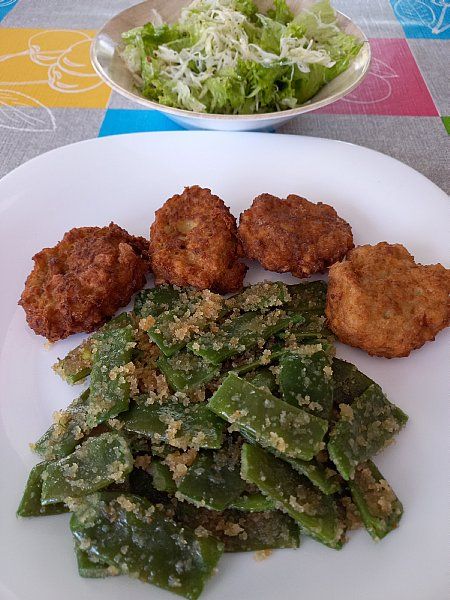 Stročji fižol na drobtinah, kitajske čuftice; zeljnata in zelena solata