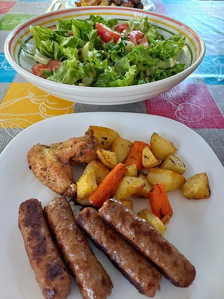 Pečen krompir, perutničke, čevapčiči; mešana solata