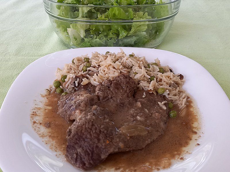 Goveji zrezek v omaki, basmati riž na grahu in šampinjonih; zelena solata