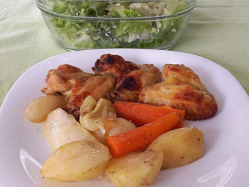 Pečene perutničke, krompir z zeljenavo; zelena solata