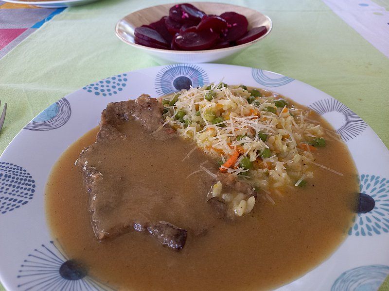 Goveji zrezek v naravni omaki, zelenjavna rižota; rdeča pesa
