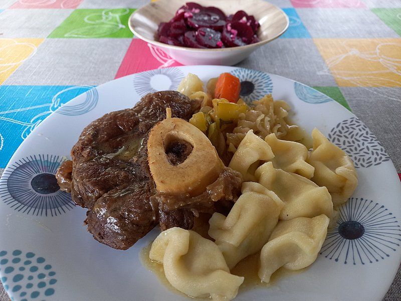 Osso- bučo z zelenjavo, žlikrofi; rdeča pesa