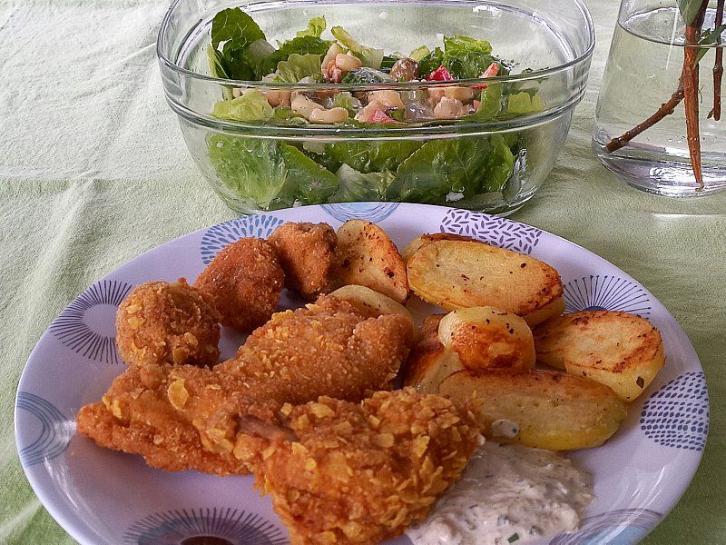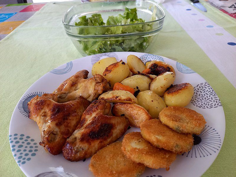 Pečene perutničke, krompir, panirane bučke; zelena solata