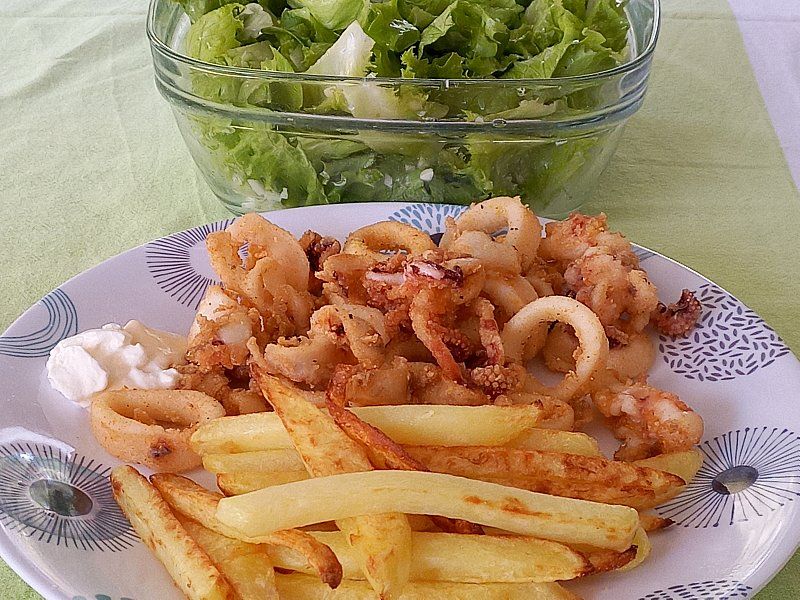 Frigani lignji, pomfri; zelena solata