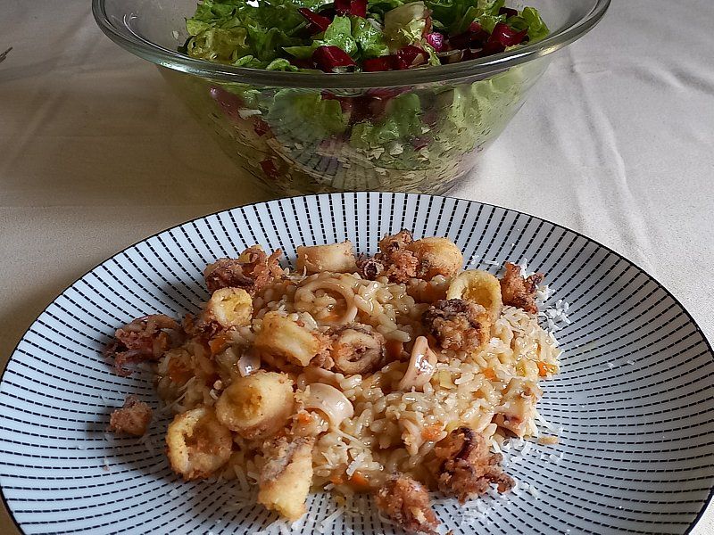 Rižota s kalamari, po vrhu frigani kalamari; endivija, radič, krompir, črna redk