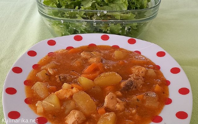 Pečeno piščančje bedro, krompir in korenček; zeljnata in motovilec solata