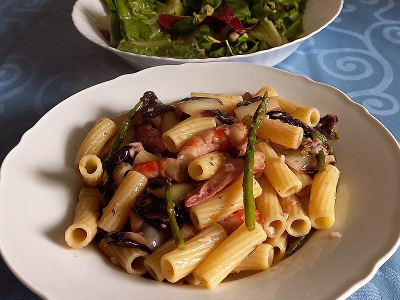Kozice s traviso radičem, beluši, makaroni; radič s krompirjem