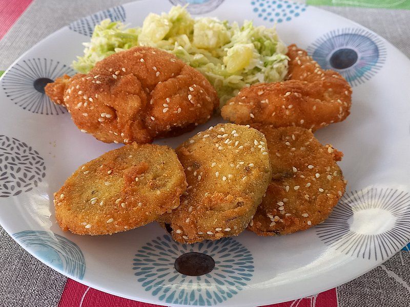 Panirane perutničke, malancani, zeljnata solata s krompirjem