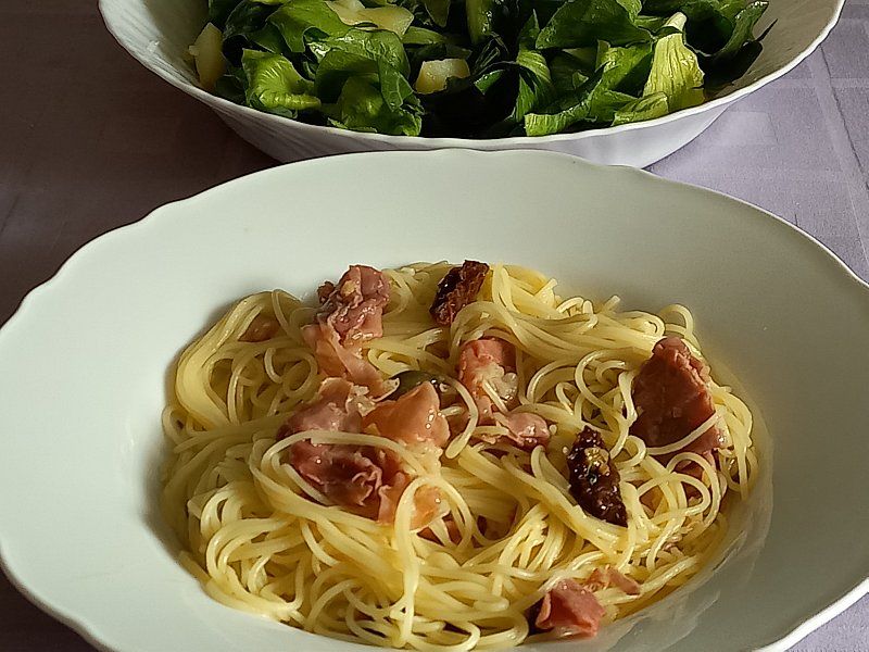 Špageti - Česen, suhi paradižnik, kapre, pršut