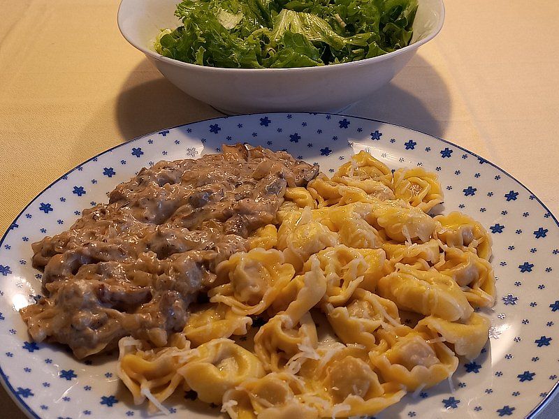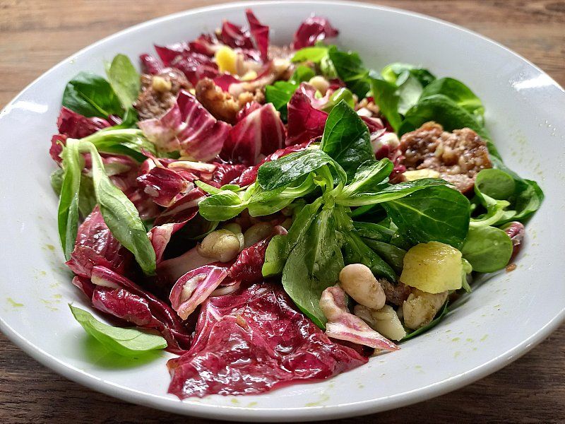 Pražena jetrca, polenta s skuto in zeliščnim maslom; zelena solata