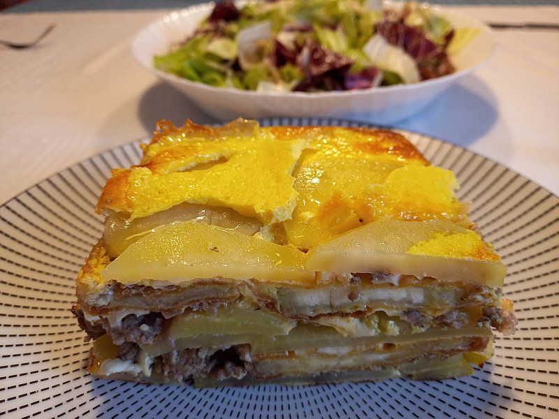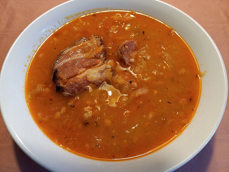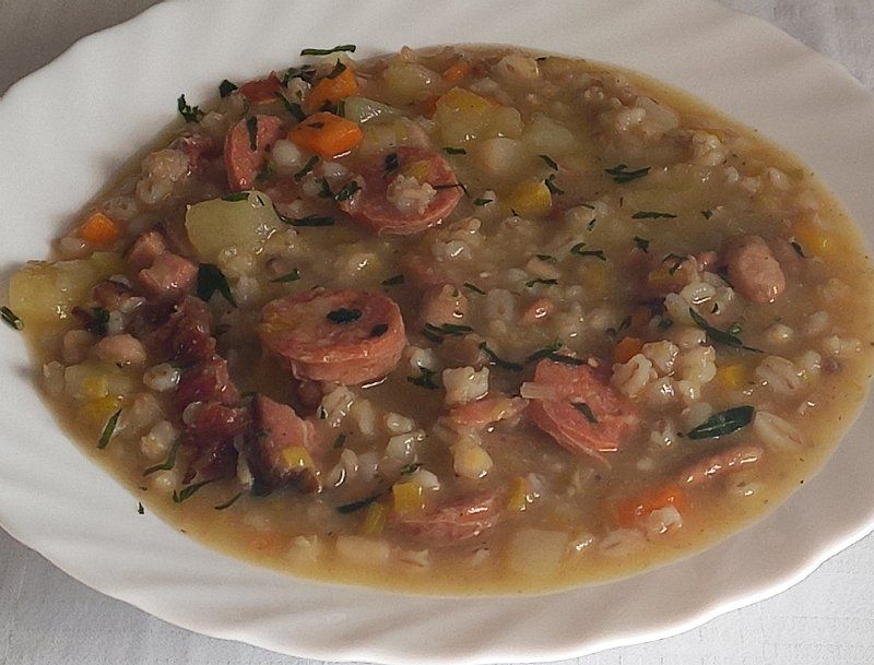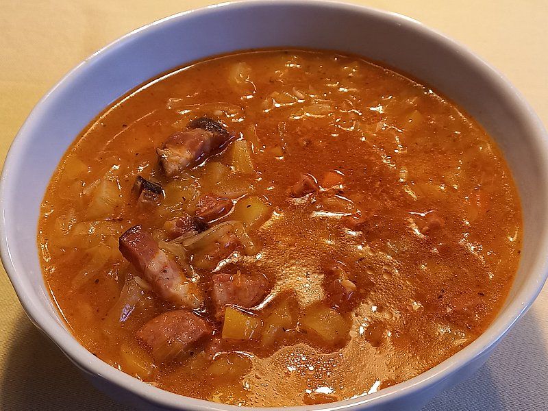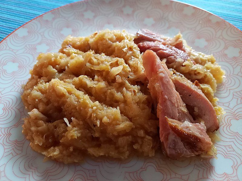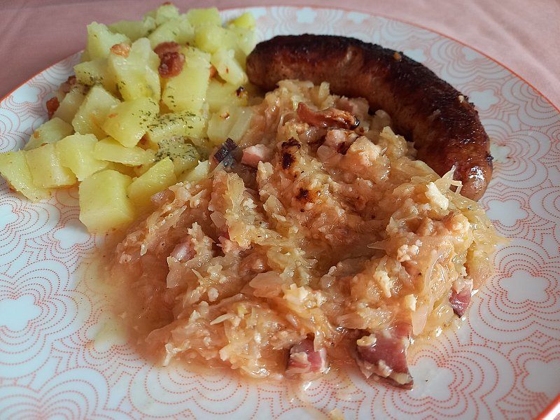 Dušeno kislo zelje s proseno kašo, zabeljen krompir, pečenica