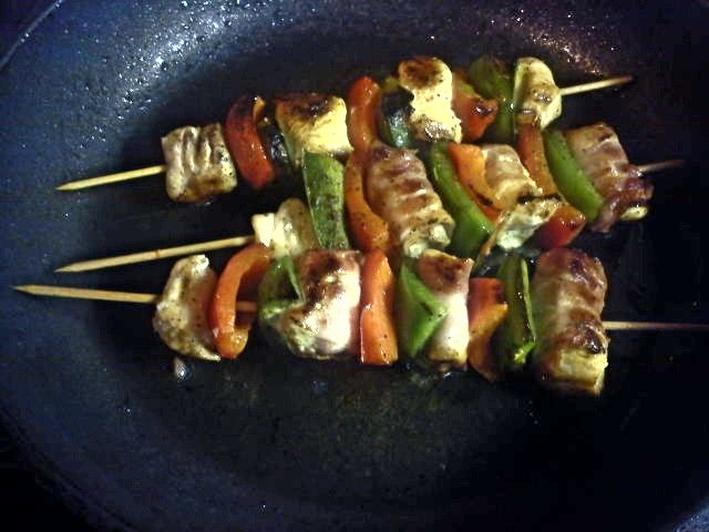 piščančji ražnjiči, z rdečo in zeleno papriko+ slanina