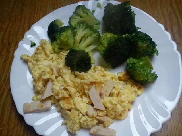 brokoli, jajčka s kislo smetano in piščančjim prsim v ovitku