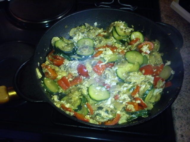 zelenjavna ponev (čebula, šampinjoni, bučke, rdeča paprika, curry in čez beljaki