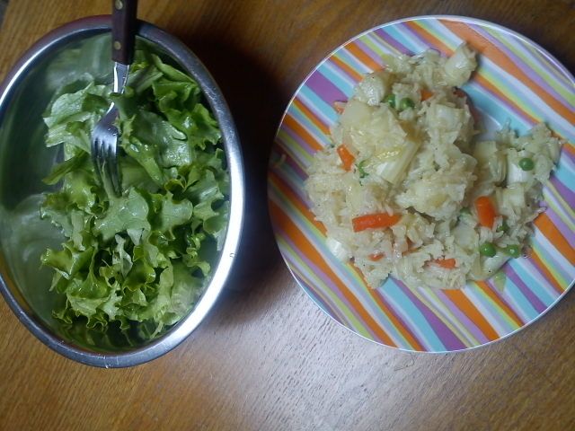 rižota z beluši, korenčkom in grahom + seveda obsezna solata
