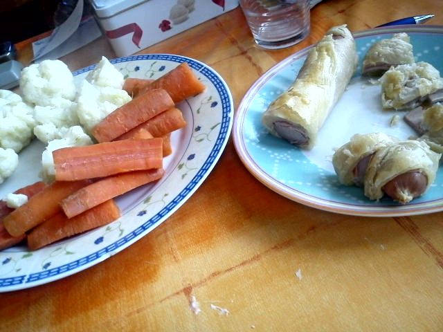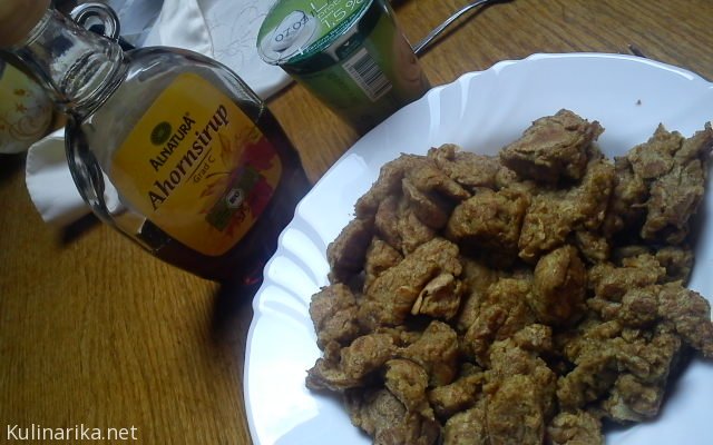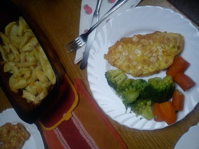 kuhan brokoli in korenje, paniran zrezek (moka, jajce, mandeljevi lističi)