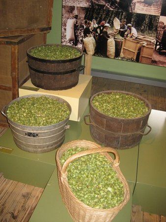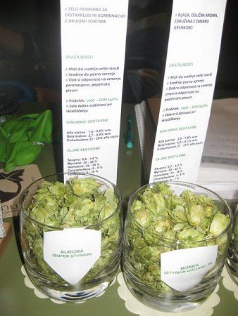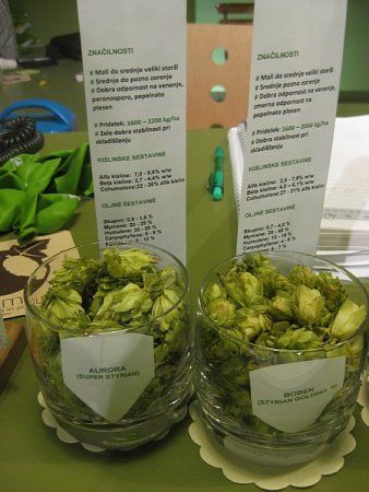 različne posode, polne hmelja - oz. ženskih soplodij - storžkov