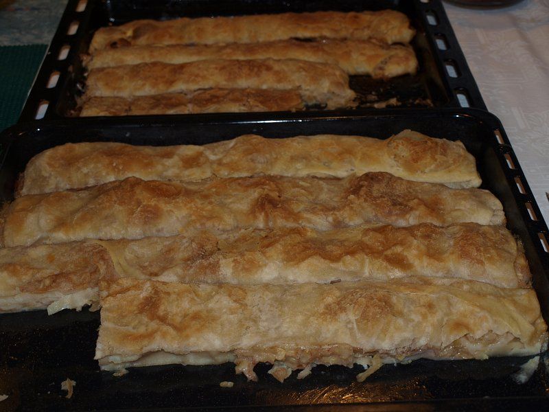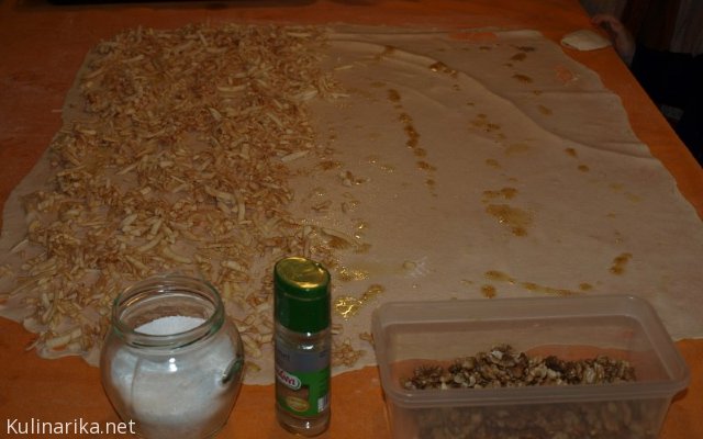 Razvlečeno poškropim z drobtinami in maslom, potem pride na vrsto nadev.