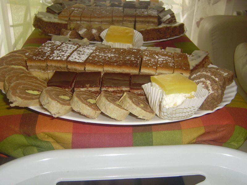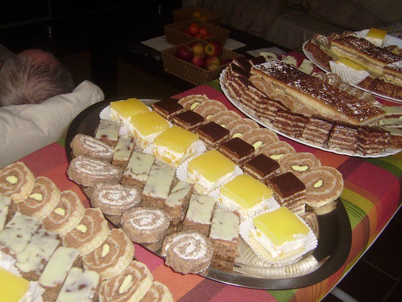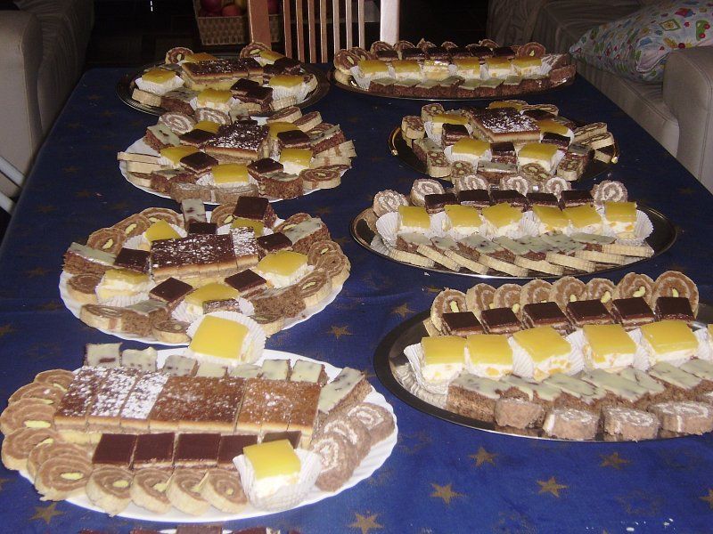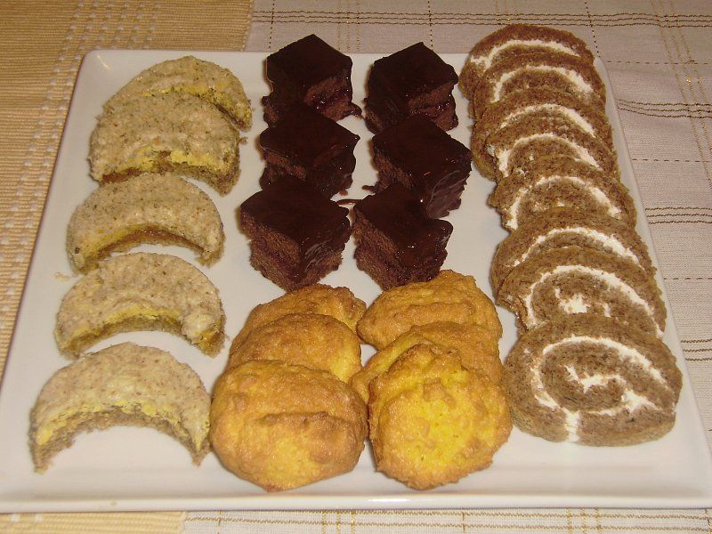 Kokosovi kupčki, orehova rulada, višnjeve kocke, lunice