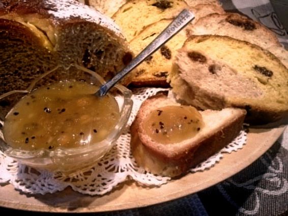 Kivijev džem na rezini tribarvne pletenice iz testa za krompirjev kruh
