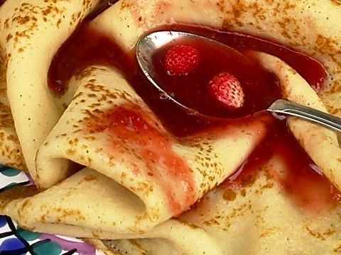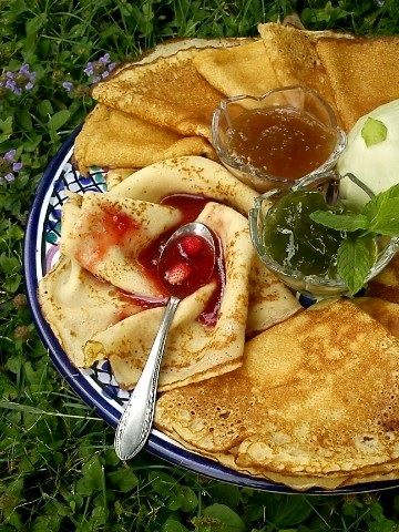 bogate jajčne palačinke s polivko iz gozdnih jagod, metino in bučno marmelado