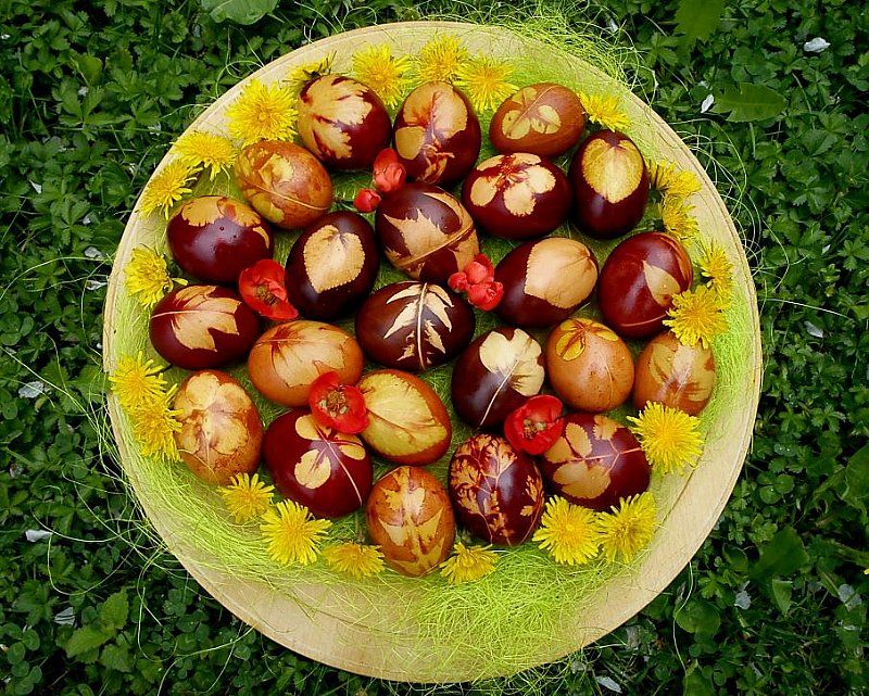Pirhi s pomladnim rastlinjem, obarvani v čebulnih olupkih, črnem čaju ...