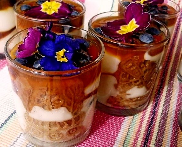 Povrh smetanovega pudinga posute razkošne ameriške borovnice in cvet primule