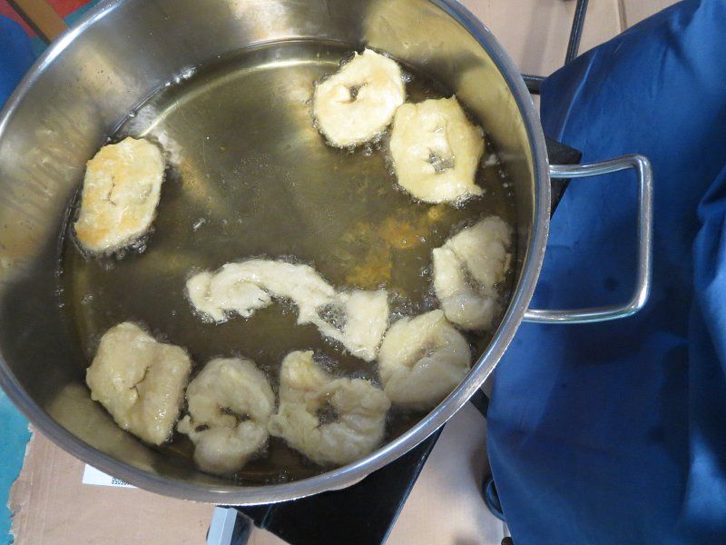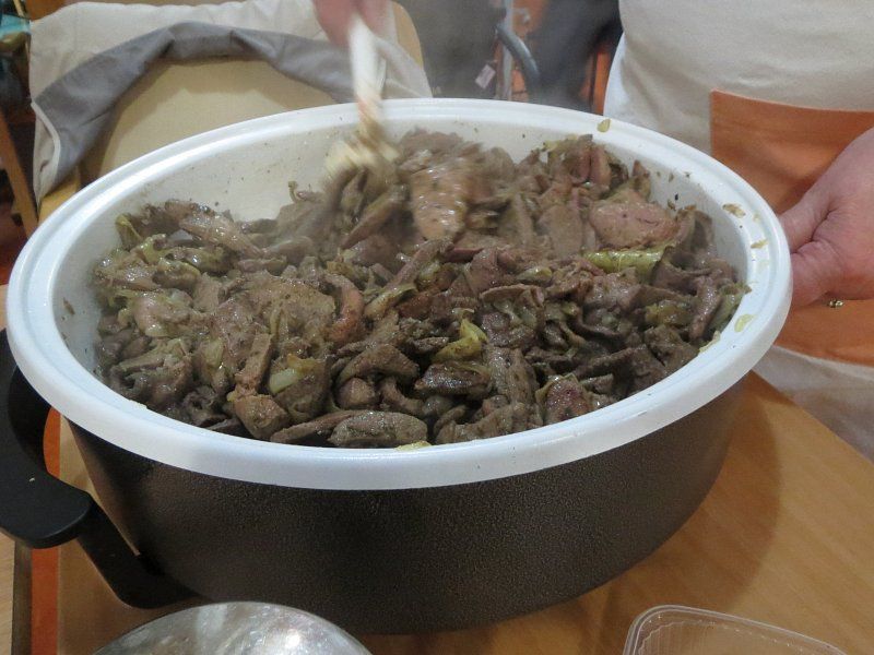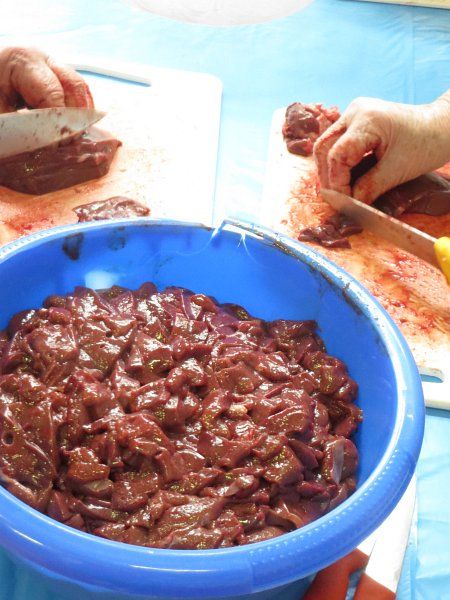 listali čebulo za praženje jetrc kar na mizah v posebnih posodah, vmes pa
