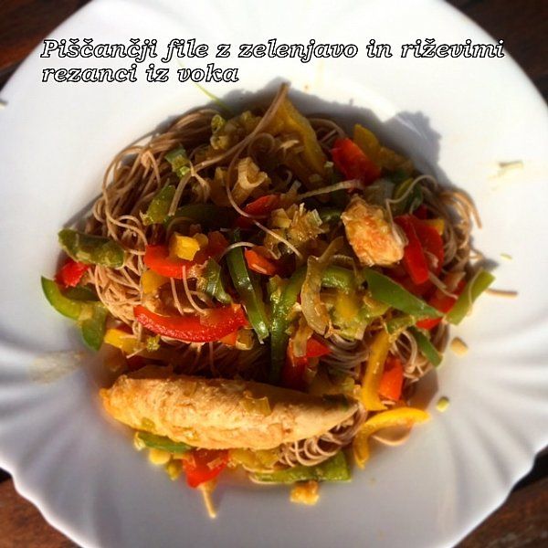 Piščančji file z zelenjavo in riževimi rezanci iz voka