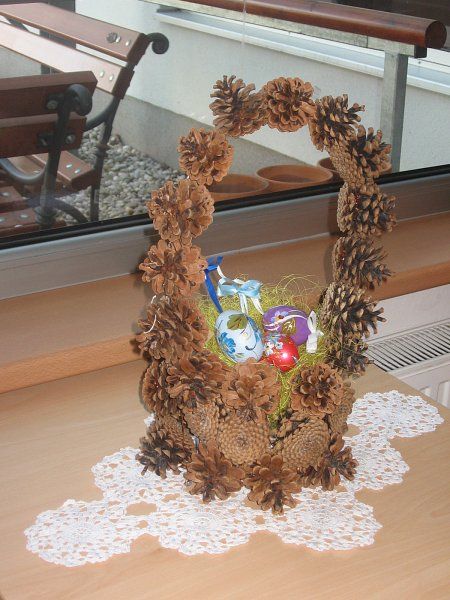 Recepcijo krasijo naši ročno izdelani piščančki ter košarica iz storžev, v njej