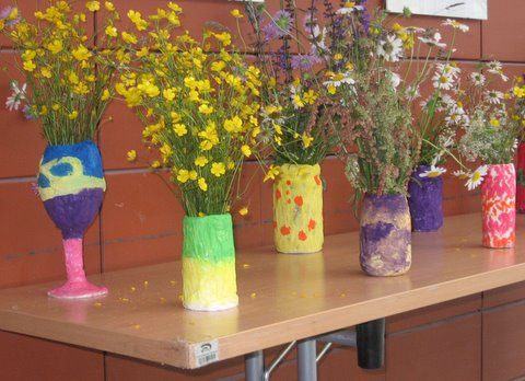 pomladna razstava travniškega cvetja v vazicah, ki so jih izdelali stanovalci