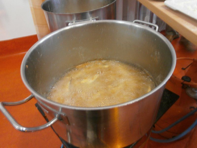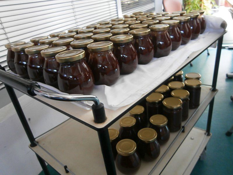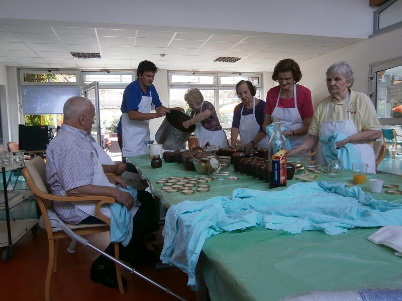 Razkoščičenje, kuhanje v atriju na plinskih gorilnikih in polnjenje kozarčkov.
