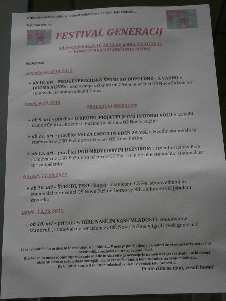 V tednu 8.-12.10. se bo v Domu odvijal "Festival generacij". Začel se bo v pone-