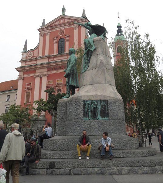 Prešeren s svojo muzo in Frančiškanska cerkev